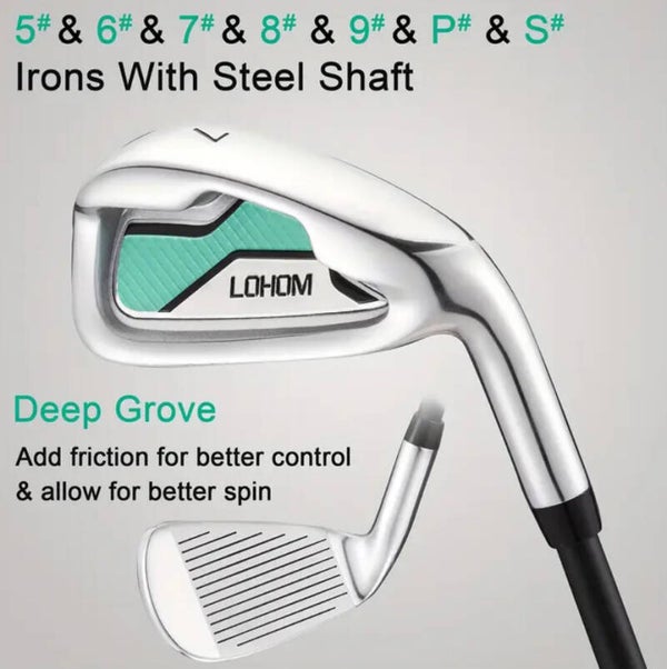 Take your game to the next level with the LOHOM Complete Golf Club Set, designed for golfers who want precision, power, and style in every swing. This premium set includes a full range of irons, hybrids, and woods, all engineered with deep-groove faces for improved spin, friction, and ball control. Whether you’re a beginner finding your rhythm or an intermediate player looking to lower your score, this set offers everything you need to perform on the course.